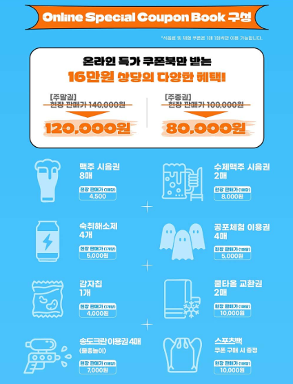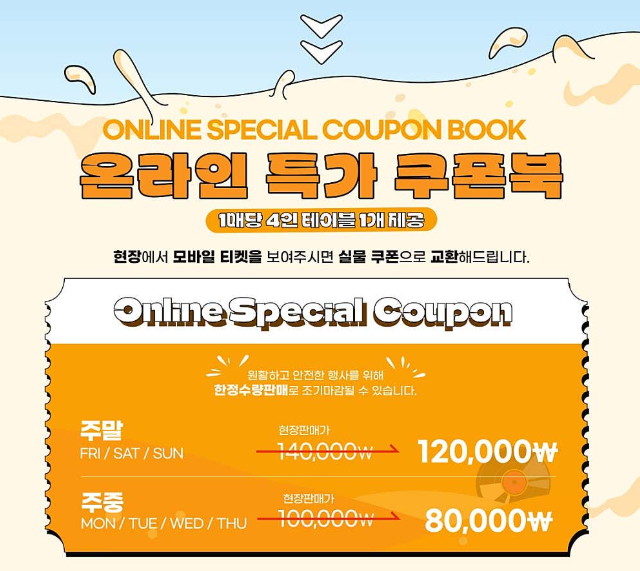 온라인특가 쿠폰북은 주말 12만원, 주중 8만원으로 1매당 4인 테이블 1개를 제공하고 맥주 시음권, 공포체험 이용권, 송도크란 등 다양한 혜택과 선착순 무료 좌석에 앉을 수 있어 가까운 곳에서 무대 공연을 즐길 수 있습니다.