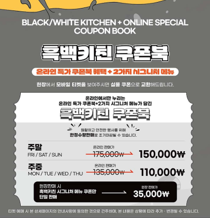 흑백키친 쿠폰북은 온라인특가 쿠폰북의 혜택과 흑백요리사 셰프들의 시그니처 메뉴 2가지를 즐길 수 있어 즐거움과 특별한 미식의 경험을 느낄 수 있는 좋은 기회입니다.